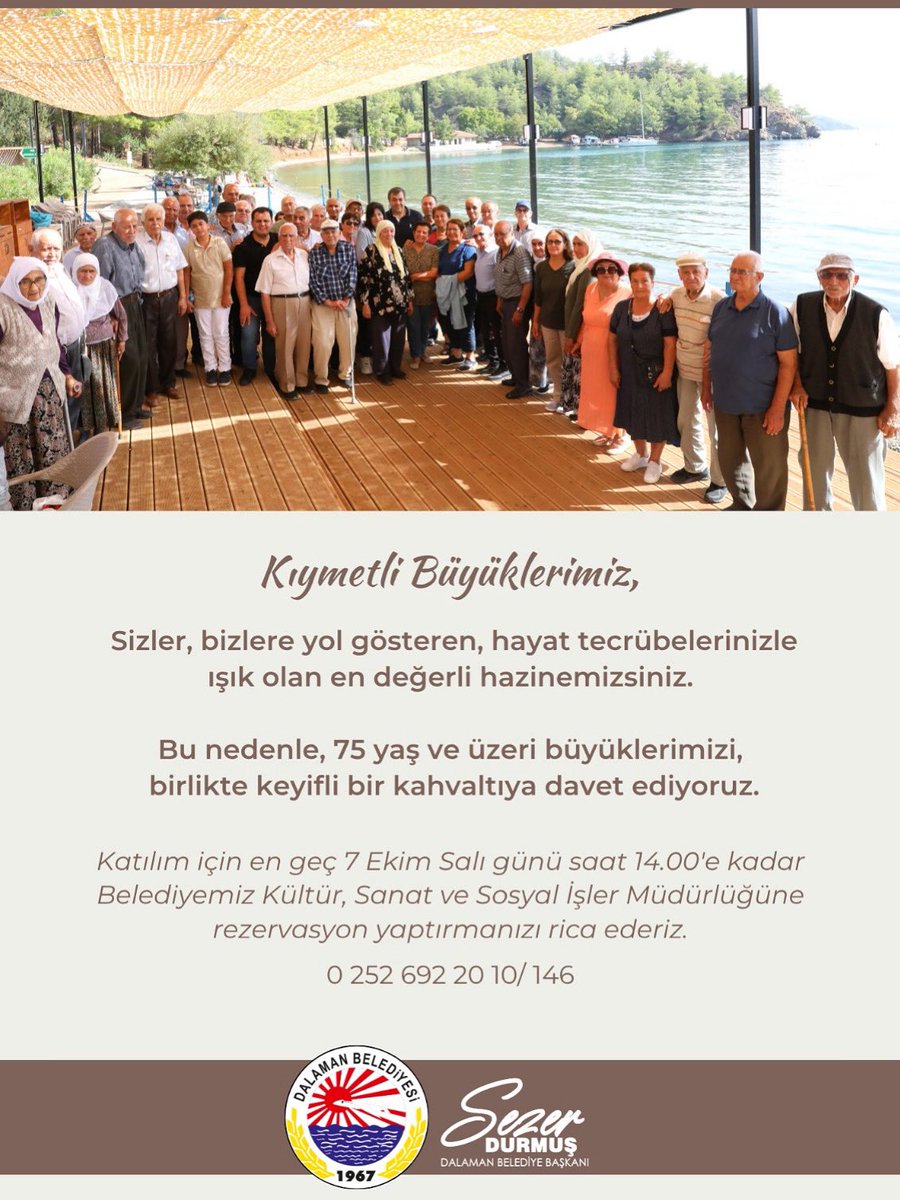 Dalaman Belediyesi, ilçedeki 75 yaş ve üzeri vatandaşlar için anlamlı bir kahvaltı etkinliği düzenliyor. Belediye, topluma yol gösteren ve tecrübeleriyle ışık olan değerli büyüklerini bir araya getirerek onlara olan minnet ve saygısını göstermeyi amaçlıyor.