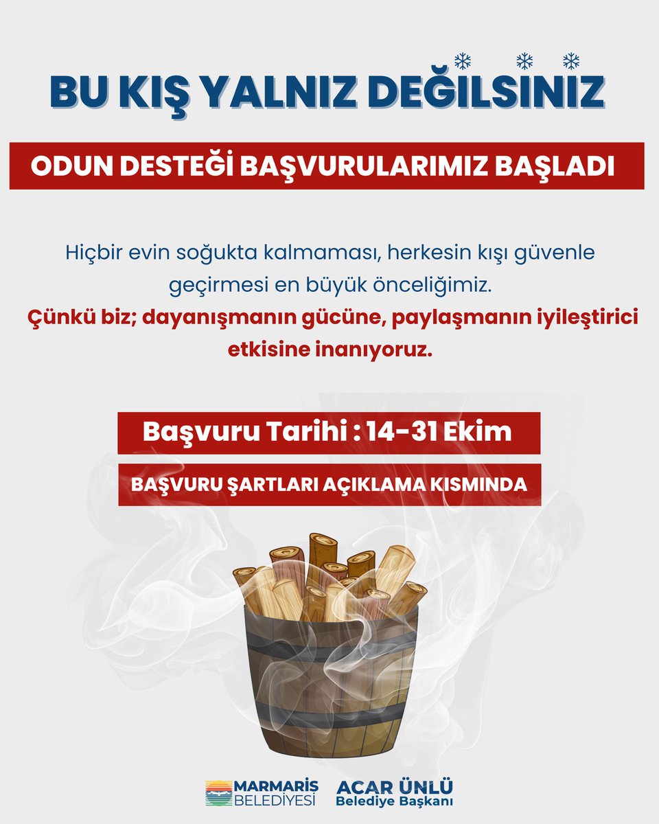 Marmaris Belediyesi, kış aylarında ihtiyaç sahibi vatandaşlar için odun dağıtımına başlayacak. "Bu Kış Yalnız Değilsiniz" sloganıyla hayata geçirilen sosyal yardım projesi, 31 Ekim 2025 tarihinde başlayacak.
