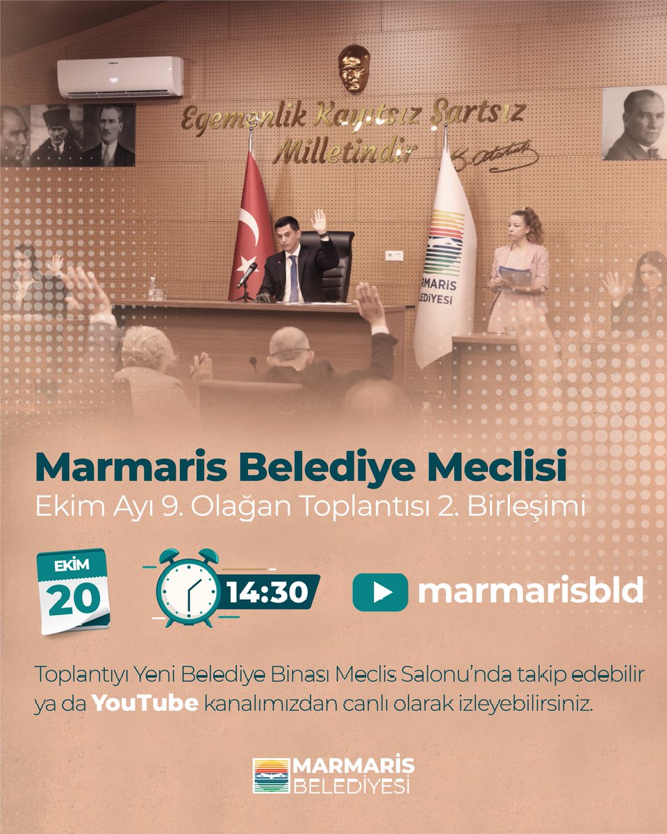 Marmaris Belediye Meclisi, 20 Ekim 2025 Pazartesi günü saat 14:30'da Belediye Meclis Salonu'nda toplanacak. Vatandaşlar, meclis görüşmelerini belirtilen salondan canlı olarak takip edebilme imkânına sahip.