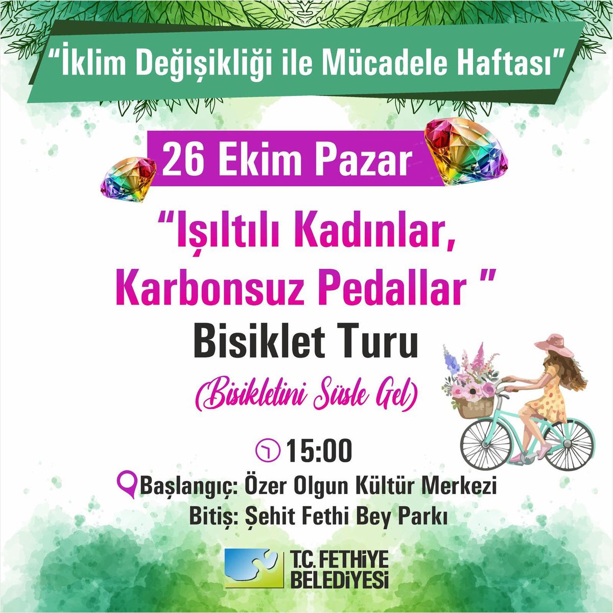 Fethiye Belediyesi, İklim Değişikliği ile Mücadele Günleri kapsamında anlamlı bir bisiklet turu düzenliyor. "Işıltılı Kadınlar, Karbonsuz Pedallar" temasıyla gerçekleşecek etkinlik, çevre bilincini artırmayı hedefliyor.