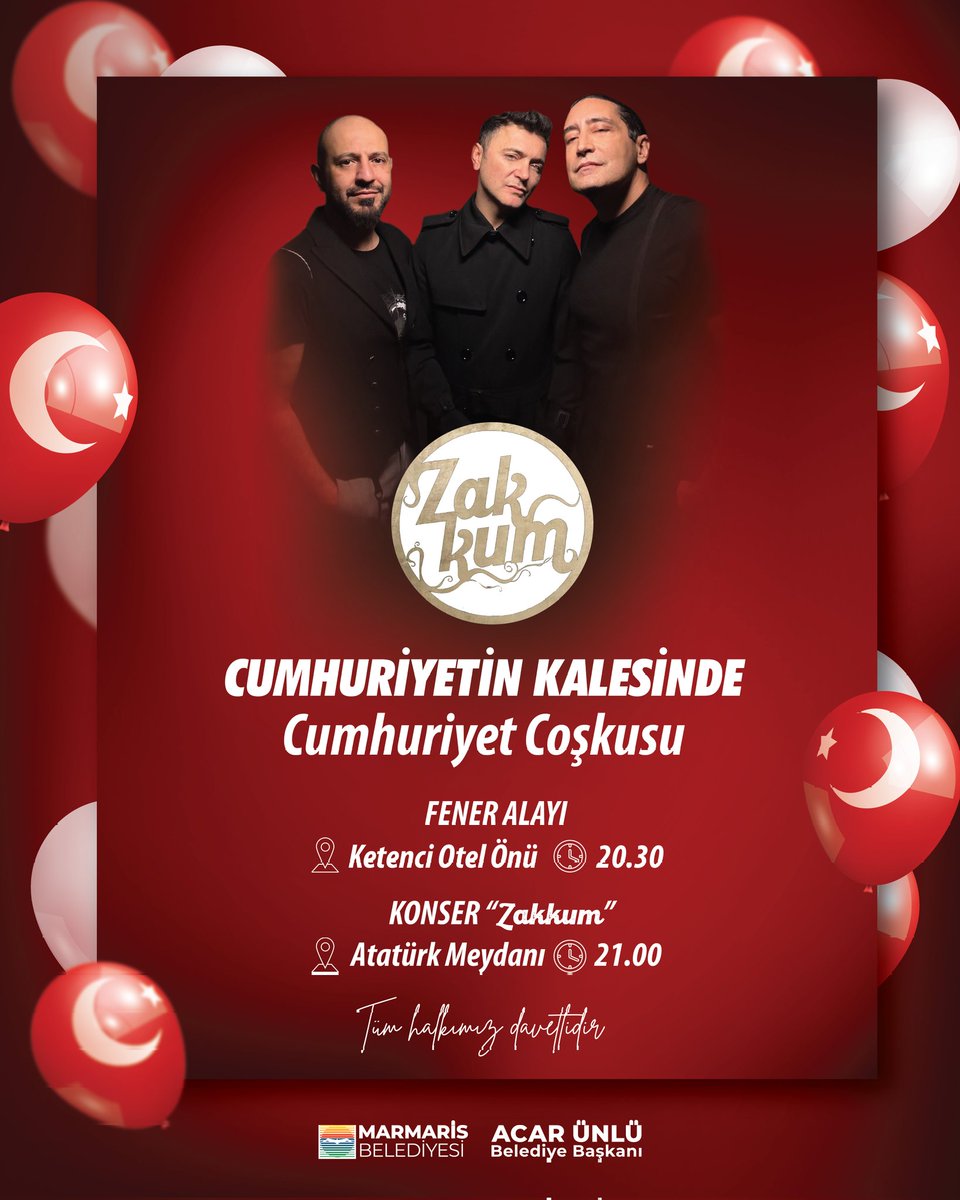 Fener Alayı'nın ardından, saat 21:00'da Atatürk Meydanı'nda sevilen müzik grubu Zakkum sahne alacak. Halkın ücretsiz olarak katılabileceği konser, Cumhuriyet Bayramı gecesine renk katacak.