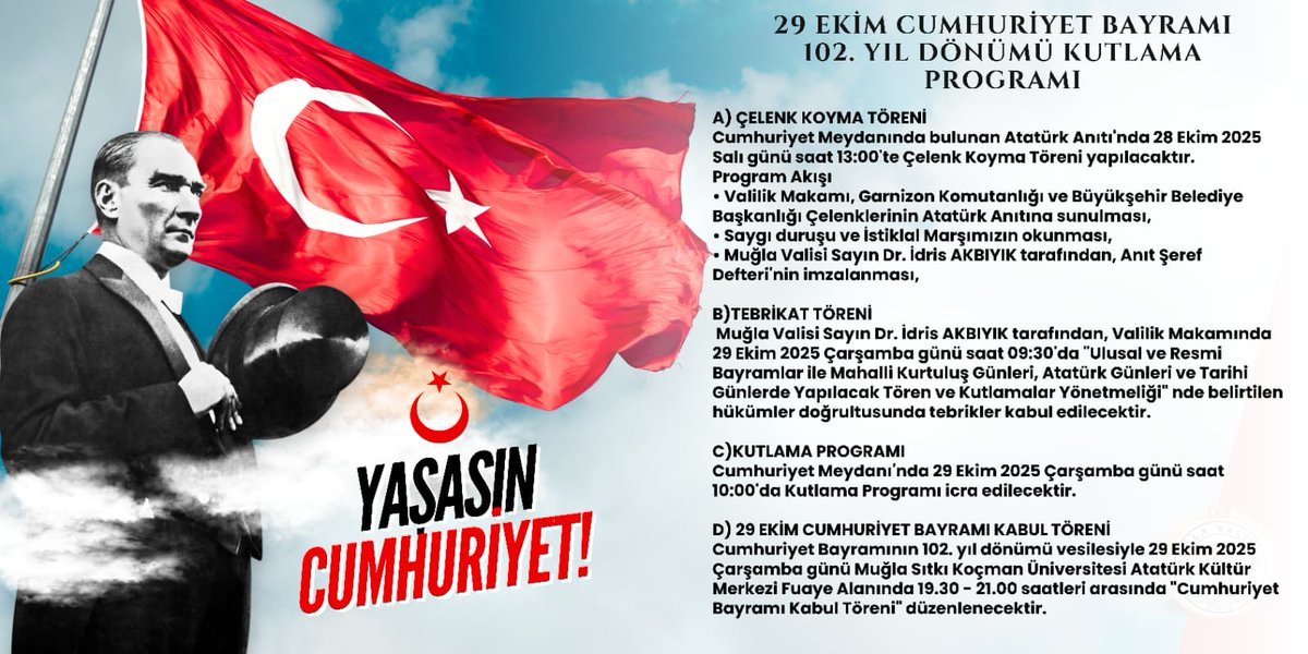 Muğla Valiliği, 29 Ekim Cumhuriyet Bayramı'nın 102. yıl dönümü nedeniyle hazırlanan kutlama programını açıkladı. İlde bir dizi etkinlikle Türkiye Cumhuriyeti'nin kuruluş yıl dönümü coşkuyla kutlanacak.