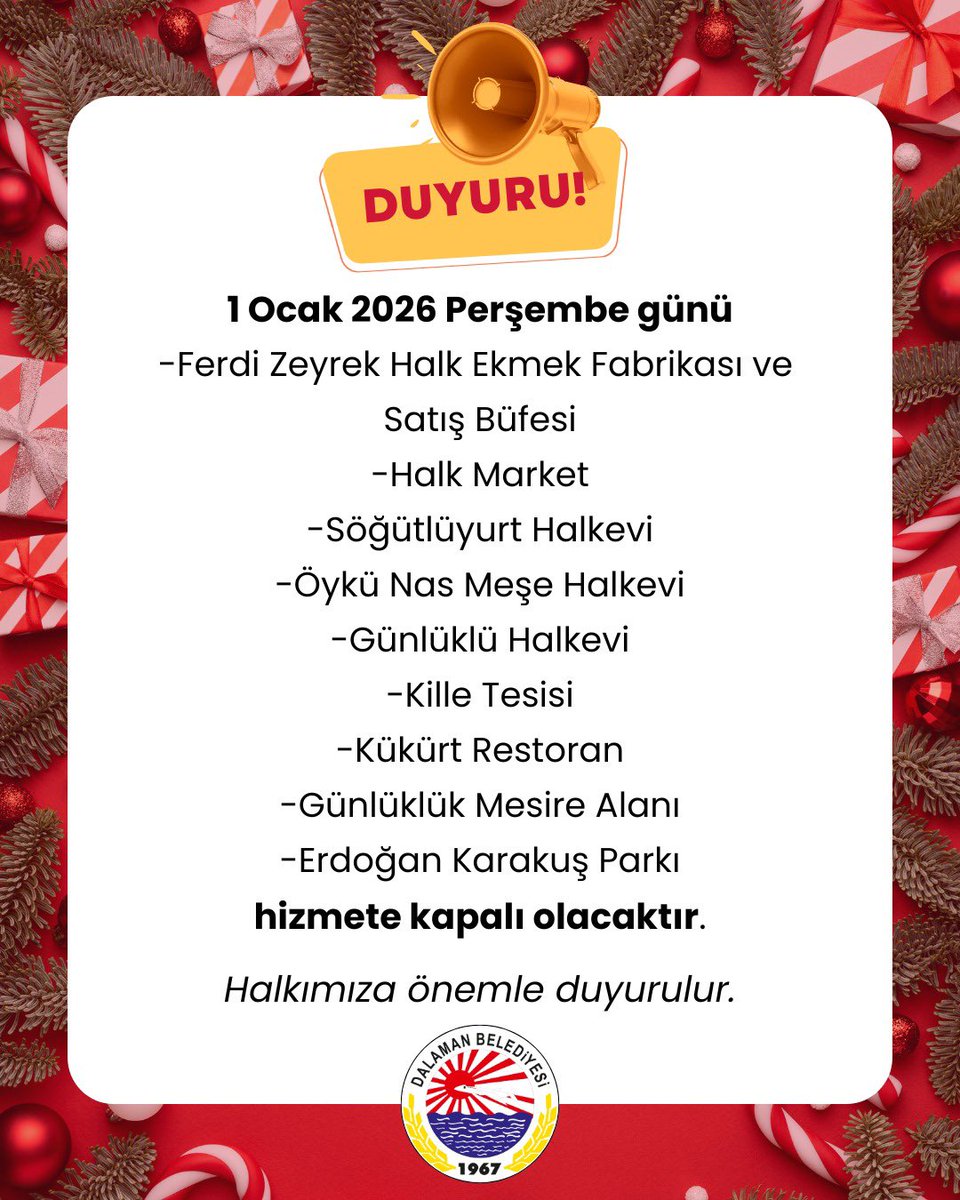 Dalaman Belediyesi, yeni yılın ilk günü olan 1 Ocak Perşembe günü resmi tatil nedeniyle hizmet vermeyecek. Bu kapsamda belediyeye bağlı birçok tesis vatandaşların kullanımına kapalı olacak.