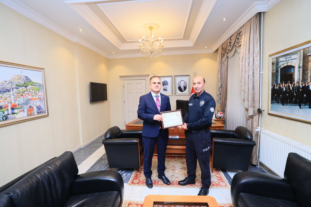 Muğla Valisi Dr. İdris Akbıyık, valilik bünyesinde uzun yıllar görev yaptıktan sonra emekliye ayrılan polis memuru Mustafa Solak’a başarı belgesi takdim etti. Gerçekleşen tören, Solak'ın meslek kariyeri boyunca sergilediği üstün hizmetleri onurlandırmayı amaçladı.