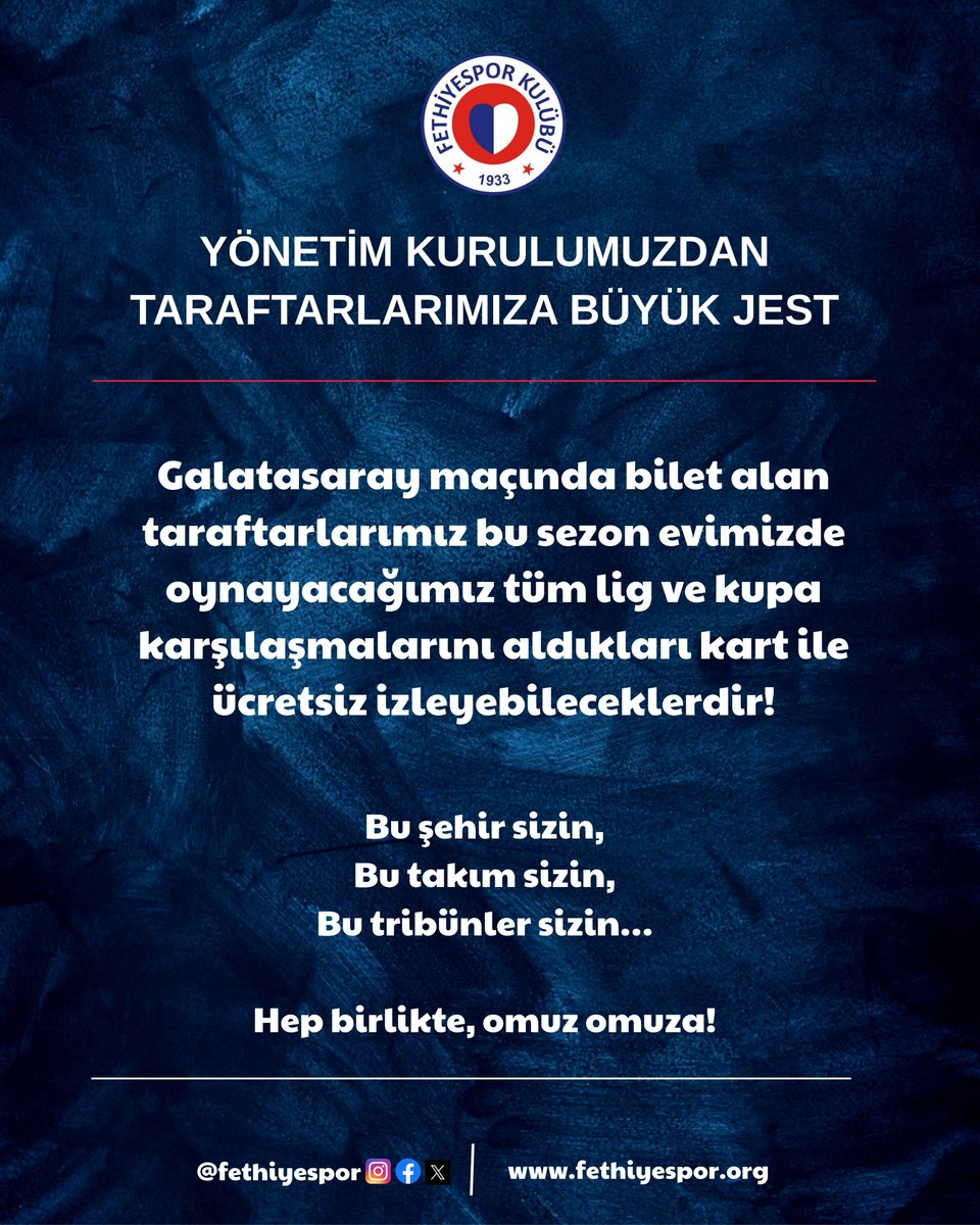 Fethiyespor yönetimi, taraftarlarına sezonun en büyük sürprizlerinden birini yaptı. Kulüp, Galatasaray maçında bilet alan tüm taraftarların, bu sezon iç sahadaki tüm lig ve kupa maçlarını ücretsiz izleyebileceğini açıkladı.