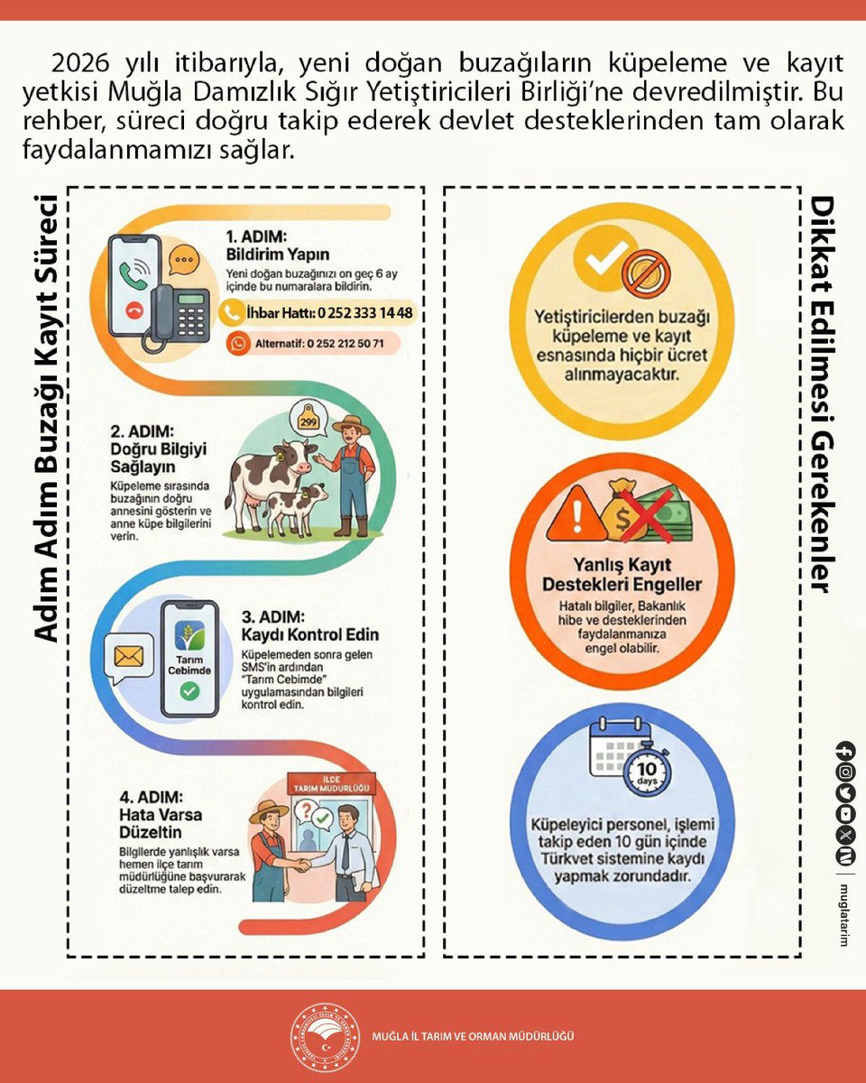 Muğla'da hayvan kayıt sisteminde önemli bir değişikliğe gidildi. 2026 yılından itibaren yeni doğan buzağıların küpelenmesi ve kayıt işlemlerinin yetkisi, Muğla Damızlık Sığır Yetiştiricileri Birliği'ne devredildi. Bu karar, ildeki hayvancılık faaliyetlerinin daha düzenli ve merkezi bir sistemle takip edilmesini amaçlıyor.