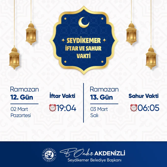 Seydikemer Belediyesi, Ramazan ayının 12. gününe denk gelen iftar vaktini duyurdu. Buna göre, iftar vakti saat 19.04'te başlayacak. Aynı günün sahur vakti ise sabah 06.05 olarak belirlendi.